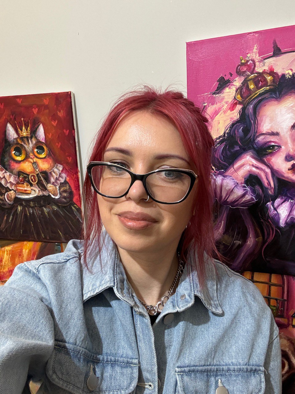She paints whimsical pop surrealist portraiture, where ancestral figures appear in a neo baroque mood with gentle rococo accents, while their present day descendants are painted in an elegant modern style.